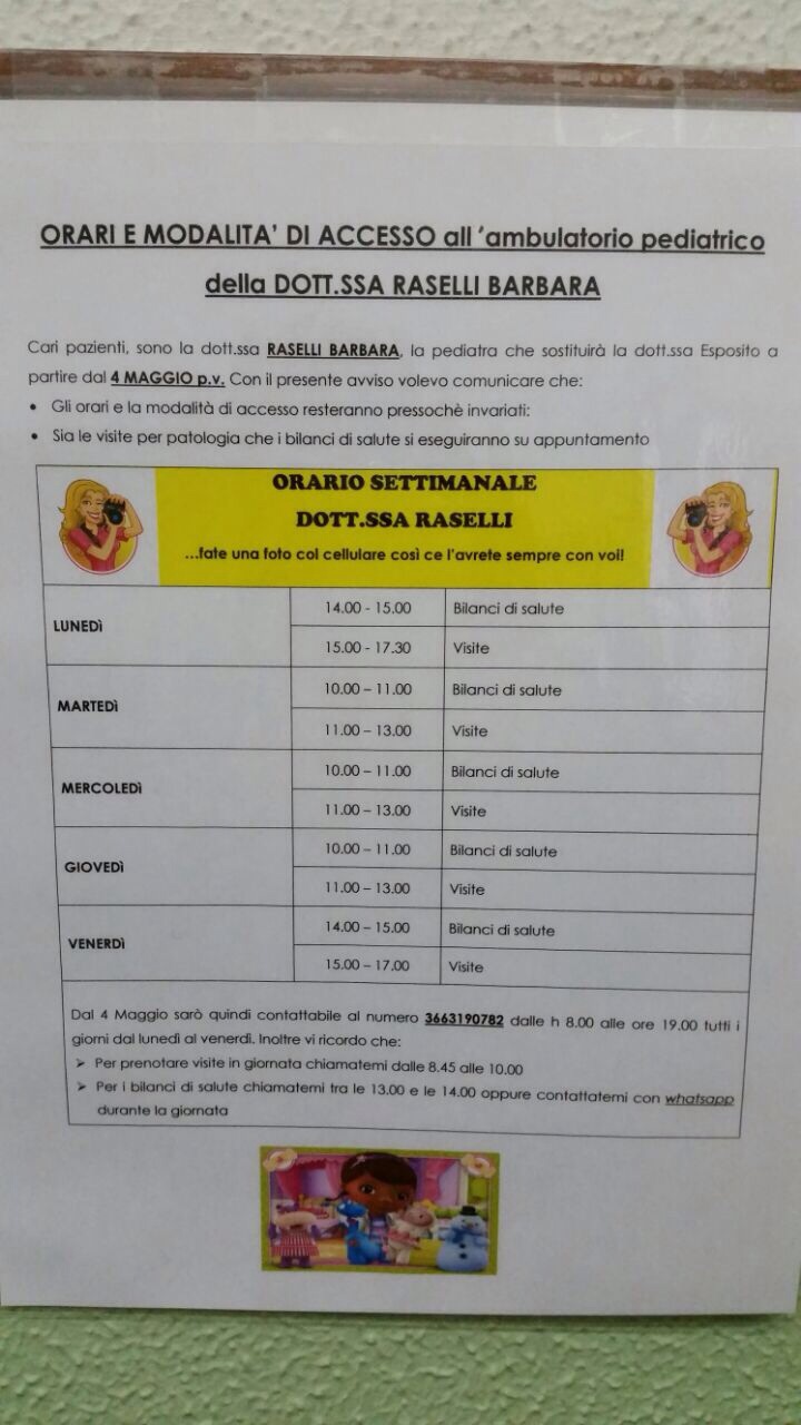 In allegato l'orario di ambulatorio della Pediatra Dott.ssa Raselli Barbara