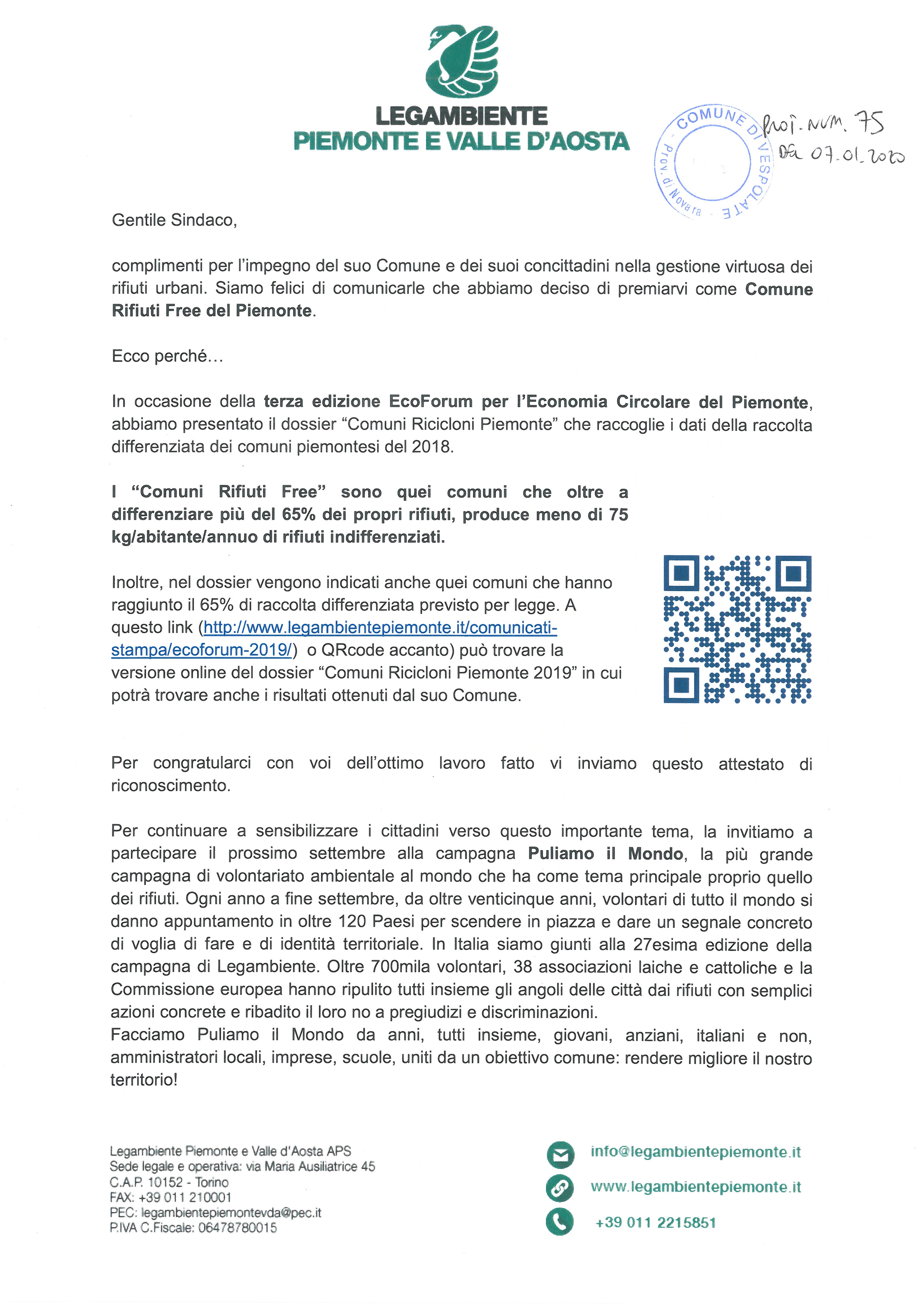 Legambiente Piemonte e Valle d'Aosta ha premiato il Comune di Vespolate per l'impegno dei cittadini nella gestione virtuosa del ciclo dei rifiuti urbani!