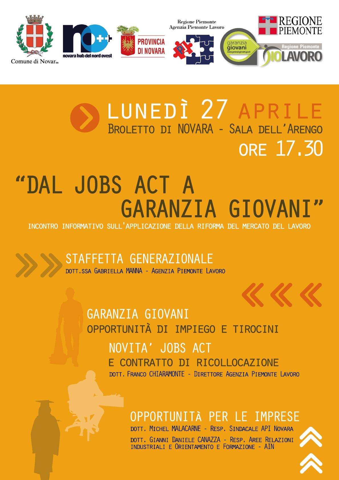 Incontro dedicato agli interventi sul mercato del lavoro "DAL JOBS ACT A GARANZIA GIOVANI" organizzato dal Comune di Novara in collaborazione con l'Agenzia Piemonte Lavoro, ente strumentale della Regione, e con la partecipazione della Provincia di Novara.